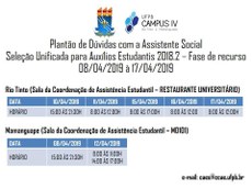 Plantão de Dúvidas com a Assistente Social - Fase de Recurso - Seleção Unificada para Auxílios Estudantis 2018.2 (edital nº 02/2019)