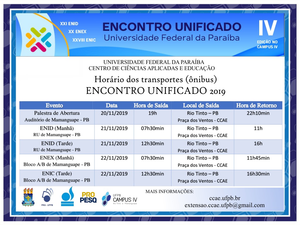 Notícias Encontro Unificado ENID, ENEX, ENIC Tweet publicado: 14/11/2019 15h04, última modificação: 19/11/2019 10h35 Programação detalhada Mapa do evento Transportes para o evento