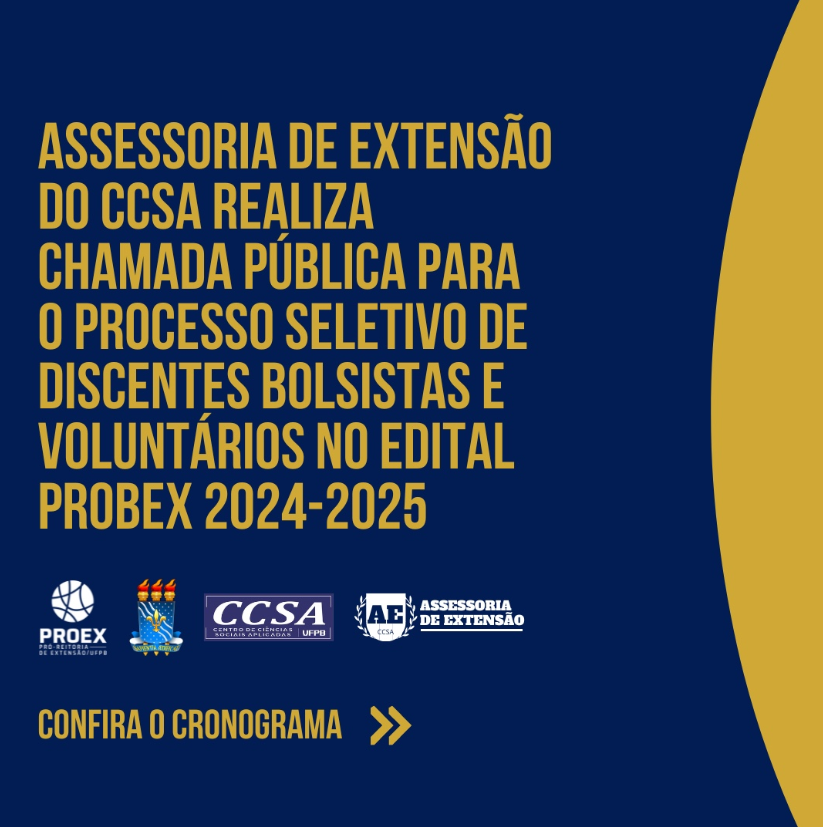 A Assessoria de Extensão do CCSA divulgou a “Chamada Pública para o Processo Seletivo de Discentes Bolsistas e Voluntários” no edital PROBEX 2024-2025.