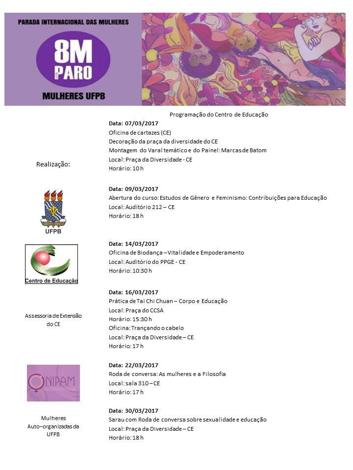 A Direção do Centro de Educação da UFPB convida toda comunidade acadêmica a participar da programação do mês de março, relativa à luta internacional por direitos das mulheres e contra a violência econômica, institucional e interpessoal. As atividades, que incluem a Greve Internacional das Mulheres, no dia 08 de março, estão sendo promovidas no CE/UFPB pela Assessoria de Extensão do Centro de Educação, NIPAM e Grupo das Mulheres Organizadas da UFPB.