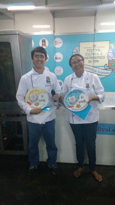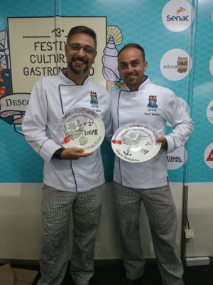 A primeira Dupla Campeã com o 1º lugar na modalidade “Entrada”, foram os Discentes: Tadeu Rena (esq.) e o Daniel Medeiros (dir.), 5º período do curso, que ganharam com o prato CAMPEÃO: "Gingado da redinha", na noite da 2ª feira (25/9).