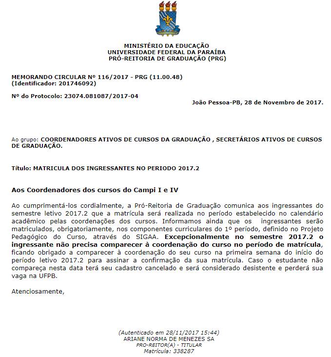 Notícias Matrícula dos Ingressantes no Período 2017.2 Tweet publicado: 29/11/2017 16h43, última modificação: 29/11/2017 16h43 Informações sobre a matrícula podem ser vistas no link a seguir: MEMORANDO