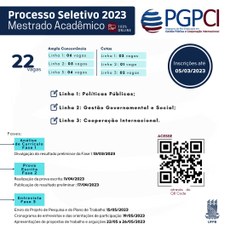 O Programa de Pós-Graduação em Gestão Pública e Cooperação Internacional da Universidade Federal da Paraíba está desde o dia 26 de dezembro de 2022 com inscrições abertas, via Sigaa, para o Processo Seletivo 2023 disponibilizando vagas para o curso de mestrado acadêmico. As inscrições permanecerão abertas online até o dia 05 de março de 2023.