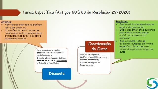 Conforme Resolução 29 de 2020, em seus artigos 60 à 63 do CAPÍTULO III do TÍTULO V, turma específica é a turma de uma disciplina solicitada pelo discente à Coordenação do Curso, através do SIG e de acordo com o Calendário Acadêmico, no caso do requerente ter possibilidade de conclusão no período corrente, de acordo com, pelo menos, um dos seguintes critérios: